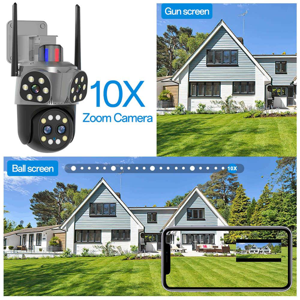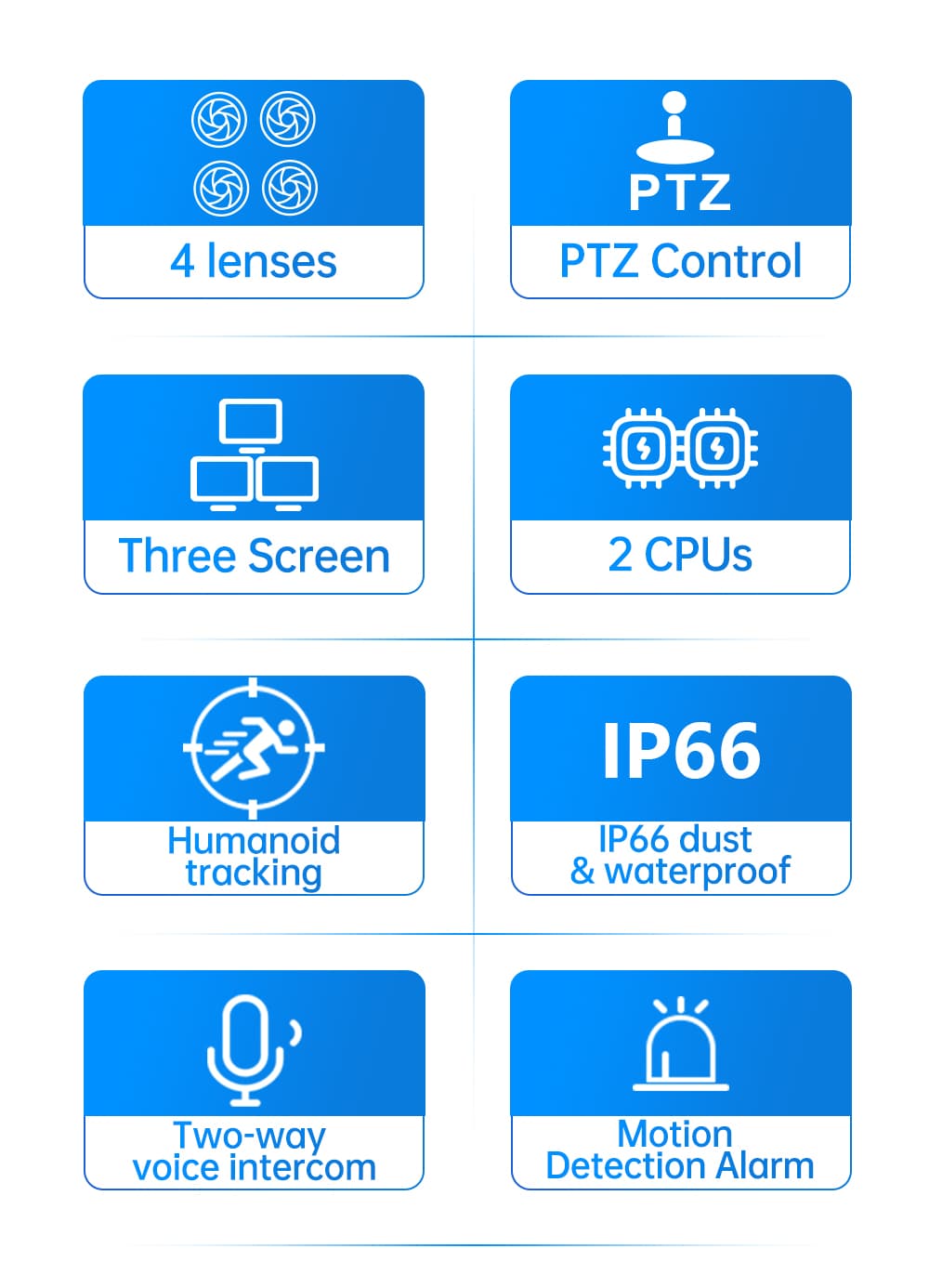 Equipped with intelligent human detection, automatic 360° PTZ tracking, and up-and-down monitoring, the camera ensures precise tracking of moving targets. Its 10× zoom capability combined with 4mm, 8mm, and 16mm lenses allows clear viewing across ultra-long distances, solving the problem of blurred vision in large areas.